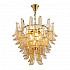 - Металлический каркас, покрытый позолотой или хромом и отполированный до зеркального блеска, состоит из нескольких ярусов, плавно сужающихся книзу. В каждом следующем ряду хрустальные «лепестки» расположены между теми, что свисают сверху.