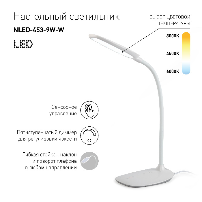 Офисная настольная лампа NLED-453-9W-W – современная модель от признанного во всем мире производителя ЭРА. – экономичное и безопасное решение для квартиры или частного дома, офисных учреждений и зданий. Светильник потребляет мало электроэнергии, светит ярко и не мерцает. Хорошо впишется в практически любой интерьер. Перед покупкой внимательно изучите: описание, фото, характеристики, отзывы покупателей и сертификаты. Модель относится к категории «Офисные настольные лампы». Подойдет для прихожей и коридора, но также отлично будет смотреться и в других комнатах или служебных помещениях. Можно крепить светильник как на обычном, так и на натяжном потолке. Подходит для комнат, как с высокими, так и с низкими потолками. В интернет-магазине «LUMARKT» продается по низкой цене 3034 руб. с бесплатной доставкой по Москве.