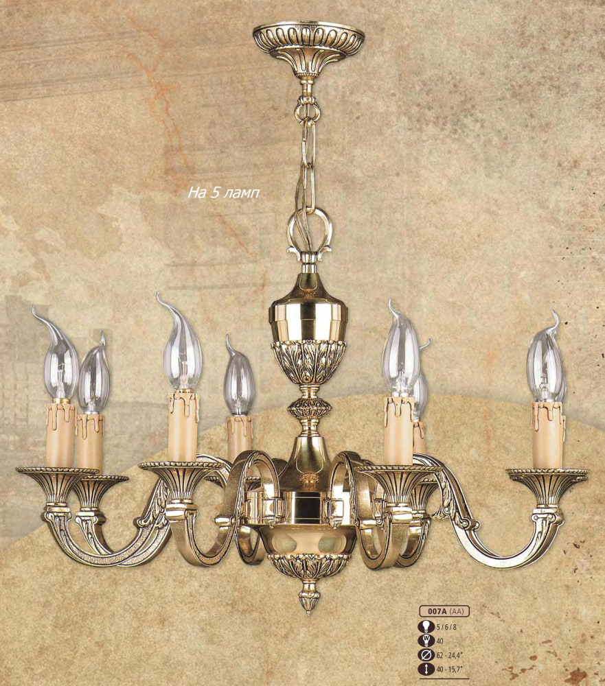 Подвесная люстра 007A 007A/5 AA это отличная модель от надежного бренда Riperlamp. – экономичное и безопасное решение для квартиры или частного дома, офисных учреждений и зданий. Прибор освещения потребляет мало электроэнергии, светит ярко и не мерцает. Идеально подойдет в практически любой интерьер. Перед покупкой внимательно прочитайте: описание, фото, характеристики, отзывы покупателей и сертификаты. Модель относится к категории «Подвесные люстры». Подойдет для зала и кухни, но также отлично будет смотреться и в других комнатах или служебных помещениях. Можно устанавливать осветительный прибор как на обычном, так и на натяжном потолке. Подходит для комнат, как с высокими, так и с низкими потолками. В интернет-магазине «LUMARKT» продается по недорогой цене 38097 руб. с бесплатной доставкой по Москве.