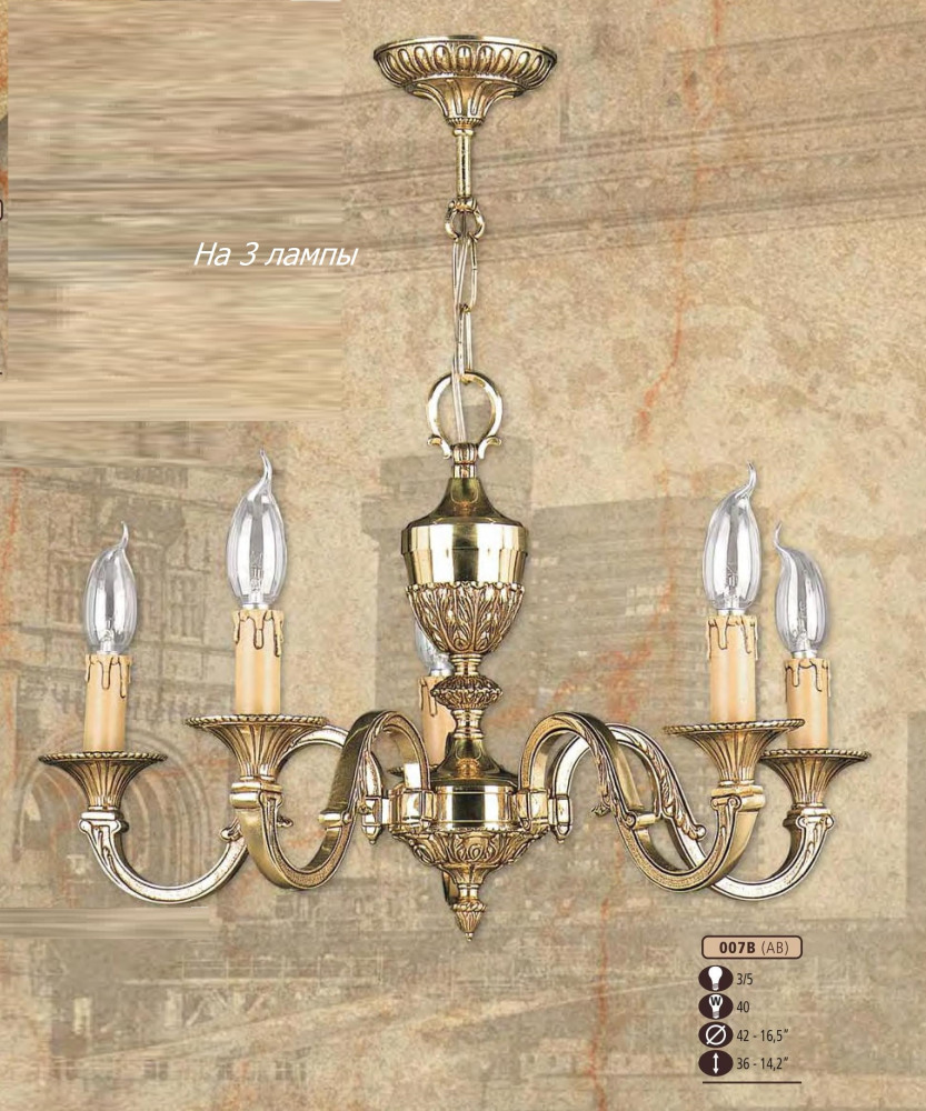 Подвесная люстра 007B 007B/3 AB – замечательная модель от надежного бренда Riperlamp. – экономичное и безопасное решение для квартиры или частного дома, офисных учреждений и зданий. Осветительный прибор потребляет мало электроэнергии, светит ярко и не мерцает. Идеально подойдет в практически любой интерьер. Перед покупкой досконально изучите: описание, фото, характеристики, отзывы покупателей и сертификаты. Модель относится к категории «Подвесные люстры». Подойдет для ванной и кухни, но также отлично будет смотреться и в других комнатах или служебных помещениях. Можно монтировать прибор освещения как на обычном, так и на натяжном потолке. Подходит для помещений, как с высокими, так и с низкими потолками. В интернет-магазине «LUMARKT» можно купить по низкой цене 24633 руб. с бесплатной доставкой по Москве.