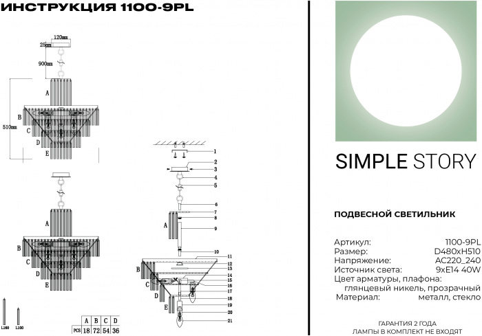 Подвесная люстра 1100 1100-9PL это современная модель от зарекомендовавшего себя производителя Simple Story. – экономичное и безопасное решение для квартиры или частного дома, офисных учреждений и зданий. Осветительный прибор потребляет мало электроэнергии, светит ярко и не мерцает. Идеально подойдет в практически любой интерьер. Перед покупкой внимательно изучите: описание, фото, характеристики, отзывы покупателей и сертификаты. Модель относится к категории «Подвесные люстры». Подойдет для гостиной и спальни, но также отлично будет смотреться и в других комнатах или служебных помещениях. Можно устанавливать светильник как на обычном, так и на натяжном потолке. Подходит для комнат, как с высокими, так и с низкими потолками. В интернет-магазине «LUMARKT» продается по низкой цене 25128 руб. с бесплатной доставкой по Москве.