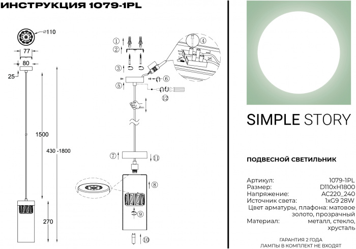 Подвесной светильник 1079 1079-1PL – элегантная модель от надежного производителя Simple Story. – экономичное и безопасное решение для квартиры или частного дома, офисных учреждений и зданий. Прибор освещения потребляет мало электроэнергии, светит ярко и не мерцает. Идеально подойдет в практически любой интерьер. Перед покупкой внимательно прочитайте: описание, фото, характеристики, отзывы покупателей и сертификаты. Модель относится к категории «Подвесные светильники». Подойдет для ванной и коридора, но также отлично будет смотреться и в других комнатах или служебных помещениях. Можно устанавливать осветительный прибор как на обычном, так и на натяжном потолке. Подходит для комнат, как с высокими, так и с низкими потолками. В интернет-магазине «LUMARKT» продается по низкой цене 8332 руб. с бесплатной доставкой по Москве.