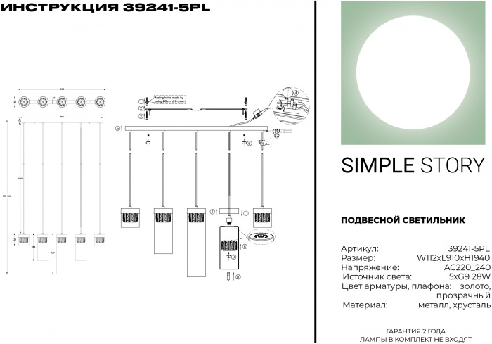 Подвесной светильник 39241 39241-5PL это хорош ая модель от зарекомендовавшего себя бренда Simple Story. – экономичное и безопасное решение для квартиры или частного дома, офисных учреждений и зданий. Осветительный прибор потребляет мало электроэнергии, светит ярко и не мерцает. Прекрасно подойдет в практически любой интерьер. Перед покупкой внимательно изучите: описание, фото, характеристики, отзывы покупателей и сертификаты. Модель относится к категории «Подвесные светильники». Подойдет для гостиной и коридора, но также отлично будет смотреться и в других комнатах или служебных помещениях. Можно монтировать осветительный прибор как на обычном, так и на натяжном потолке. Подходит для комнат, как с высокими, так и с низкими потолками. В интернет-магазине «LUMARKT» можно купить по недорогой цене 37440 руб. с бесплатной доставкой по Москве.