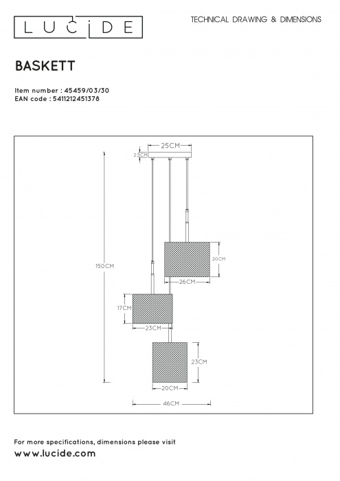 Подвесной светильник Baskett 45459/03/30 – замечательная модель от зарекомендовавшего себя производителя Lucide. – экономичное и безопасное решение для квартиры или частного дома, офисных учреждений и зданий. Светильник потребляет мало электроэнергии, светит ярко и не мерцает. Идеально впишется в практически любой интерьер. Перед покупкой внимательно прочитайте: описание, фото, характеристики, отзывы покупателей и сертификаты. Модель относится к категории «Подвесные светильники». Подойдет для зала и коридора, но также отлично будет смотреться и в других комнатах или служебных помещениях. Можно крепить прибор освещения как на обычном, так и на натяжном потолке. Подходит для комнат, как с высокими, так и с низкими потолками. В интернет-магазине «LUMARKT» продается по низкой цене 26710 руб. с бесплатной доставкой по Москве.