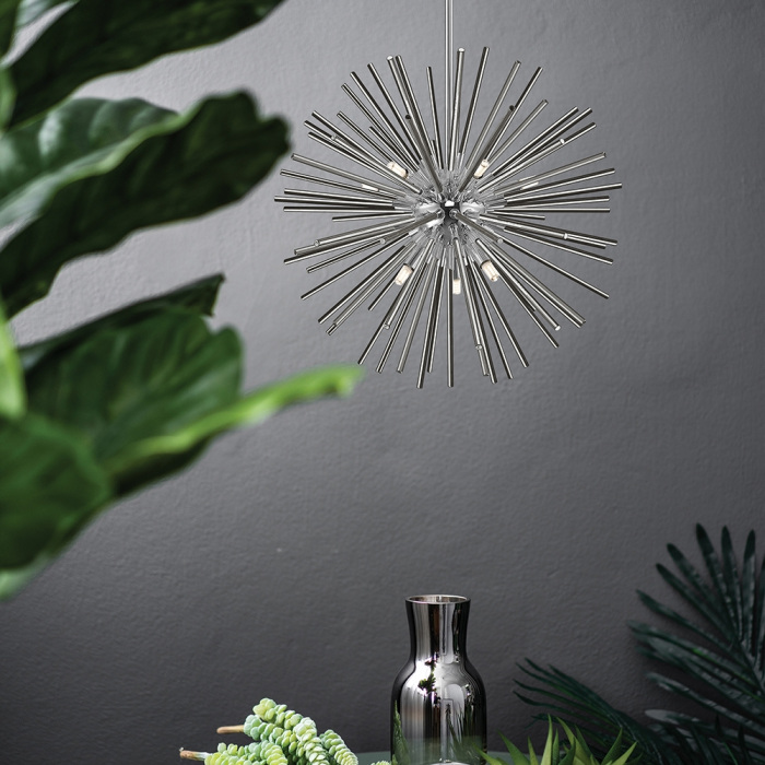 Потолочная люстра Urchin P0491-09F-F4AN – замечательная модель от надежного производителя Zumaline. – экономичное и безопасное решение для квартиры или частного дома, офисных учреждений и зданий. Прибор освещения потребляет мало электроэнергии, светит ярко и не мерцает. Идеально подойдет в практически любой интерьер. Перед покупкой досконально прочитайте: описание, фото, характеристики, отзывы покупателей и сертификаты. Модель относится к категории «Люстры на штанге». Подойдет для ванной и детской, но также отлично будет смотреться и в других комнатах или служебных помещениях. Можно устанавливать светильник как на обычном, так и на натяжном потолке. Подходит для помещений, как с высокими, так и с низкими потолками. В интернет-магазине «LUMARKT» можно купить по недорогой цене 31803 руб. с бесплатной доставкой по Москве.