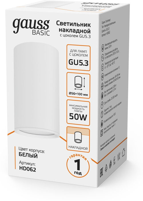 Точечный светильник HD062 – замечательная модель от зарекомендовавшего себя бренда Gauss. – экономичное и безопасное решение для квартиры или частного дома, офисных учреждений и зданий. Светильник потребляет мало электроэнергии, светит ярко и не мерцает. Идеально подойдет в практически любой интерьер. Перед покупкой внимательно прочитайте: описание, фото, характеристики, отзывы покупателей и сертификаты. Модель относится к категории «Накладные светильники». Подойдет для зала и кухни, но также отлично будет смотреться и в других комнатах или служебных помещениях. Можно монтировать прибор освещения как на простом, так и на натяжном потолке. Подходит для комнат, как с высокими, так и с низкими потолками. В интернет-магазине «LUMARKT» можно купить по недорогой цене 335 руб. с бесплатной доставкой по Москве.